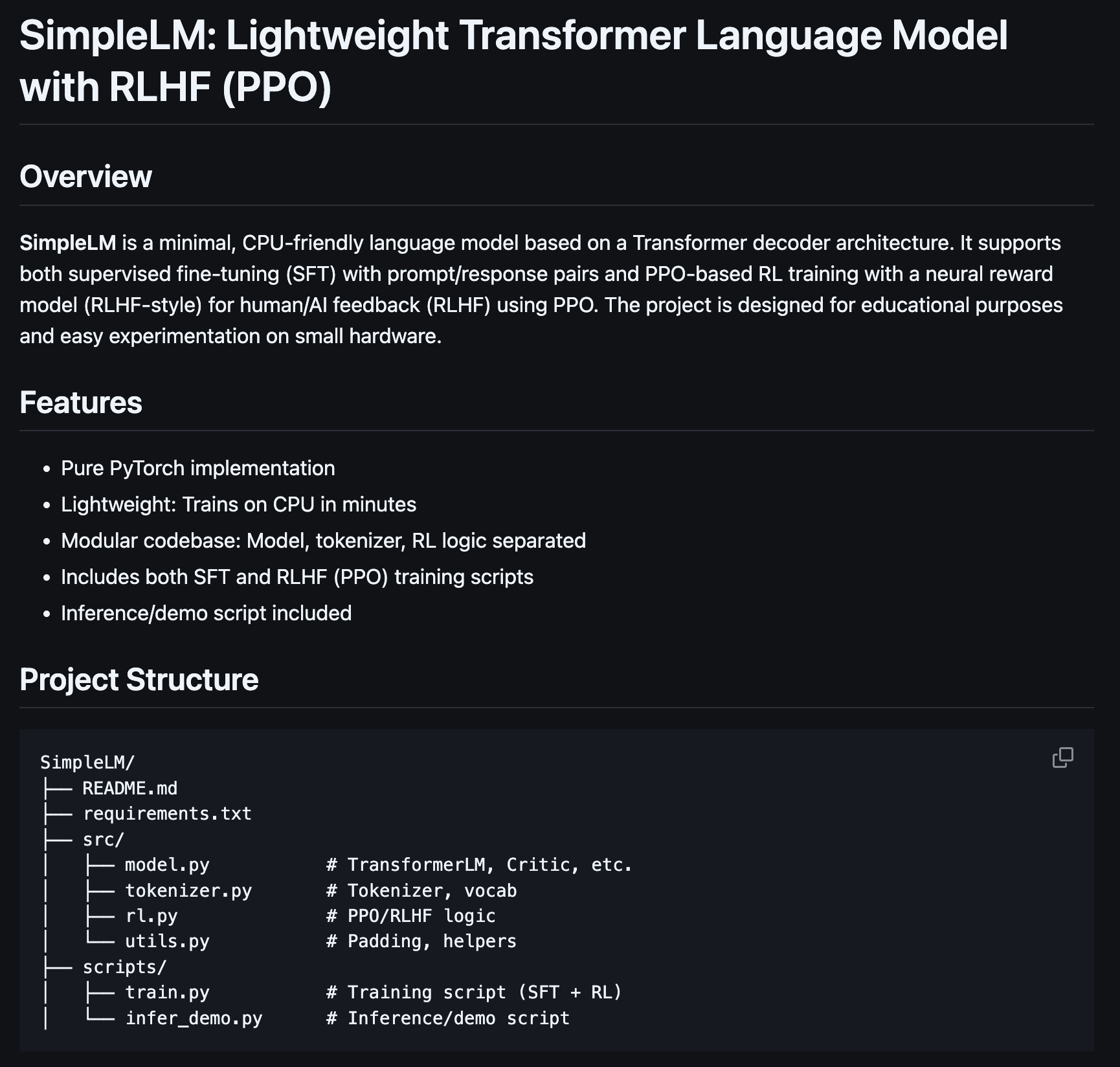 SimpleLM is a minimal, CPU-friendly language model based on a Transformer decoder architecture. It supports both supervised fine-tuning (SFT) with prompt/response pairs and PPO-based RL training with a neural reward model (RLHF-style) for human/AI feedback (RLHF) using PPO. The project is designed for educational purposes and easy experimentation on small hardware.